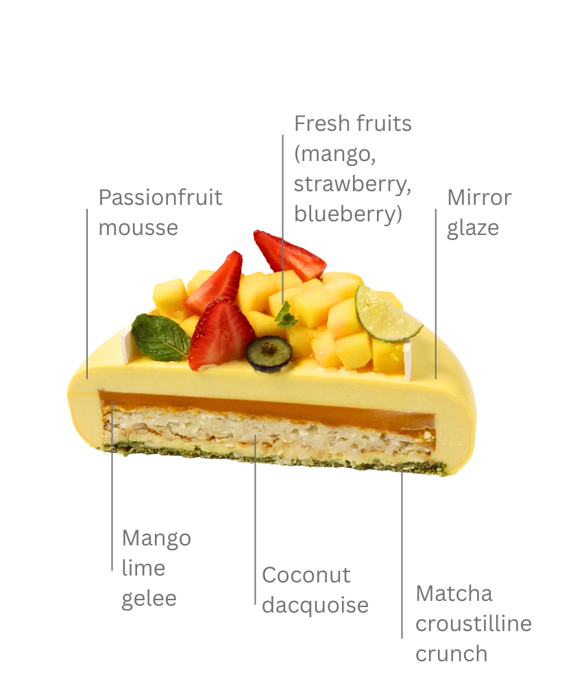 Built on a light coconut dacquoise base, this cake features layers of lush mango and passionfruit mousse that deliver a refreshing burst of tropical sweetness and tanginess, and is balanced with matcha crunch. Each bite is creamy, smooth, and perfectly balanced, finished with a glossy mirror glaze and artful fresh fruit and chocolate accents for a stunning presentation.