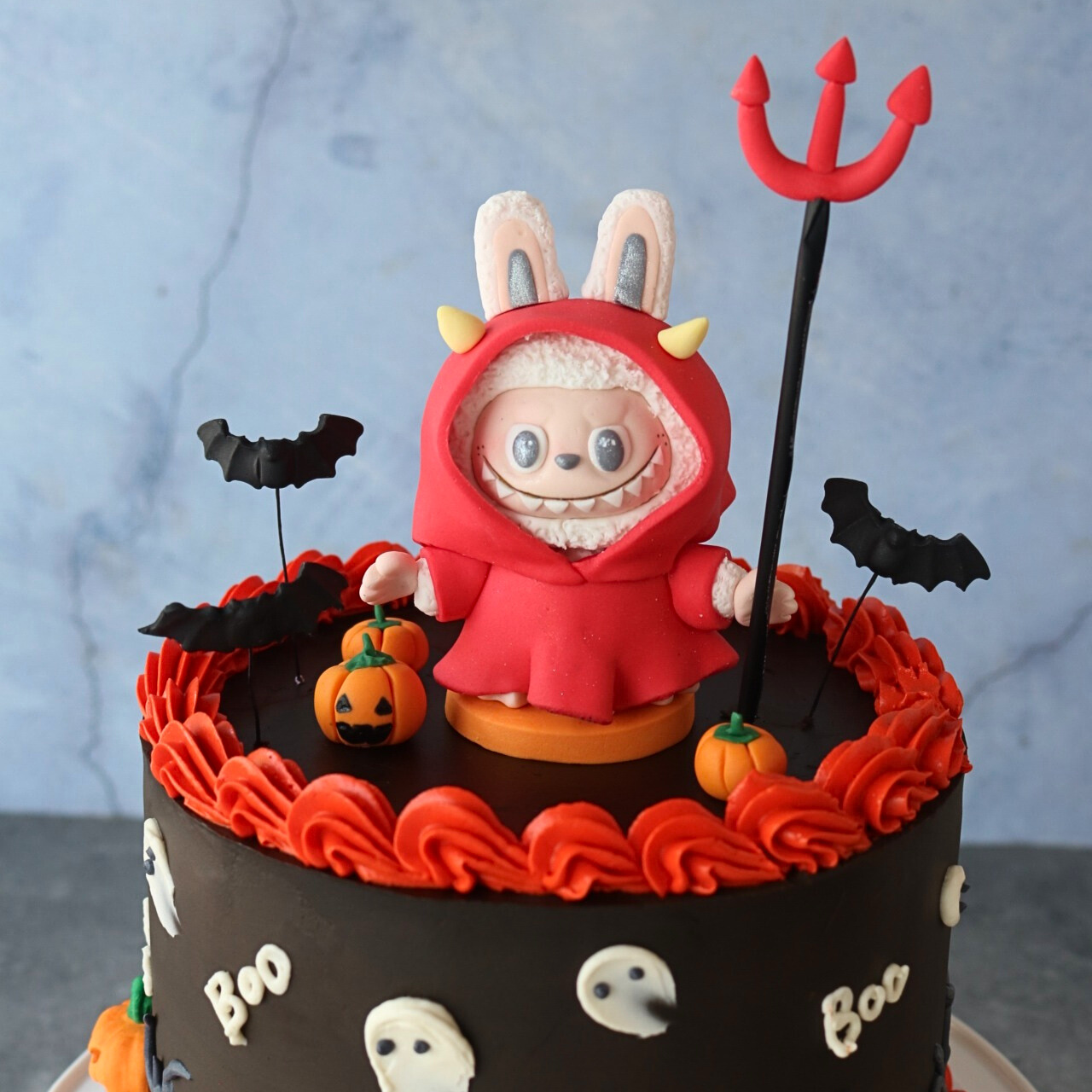 Handmade edible fondant Labubu figurine with devil costume on top a spooky cute and delicious Halloween cake.